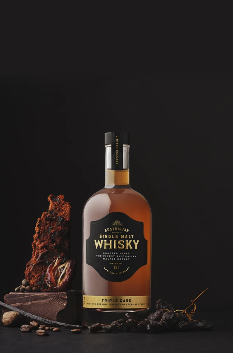 Crafted from meticulously sourced local malt and distilled in traditional copper pot stills, this whisky embodies the spirit of our land. Matured locally in a harmonious blend of ex-Bourbon oak casks from Kentucky’s renowned Heaven Hill Distillery, and then carefully finished in Australia’s finest Apera and Tawny casks, our whisky develops a rich, complex profile. Notes of dried fruit and spice, reminiscent of a traditional fruit cake, intertwine with the sweetness imparted by the Apera cask finish and the subtle nuances of dark chocolate and coffee from the oak. The result is a whisky of exceptional elegance, characterised by a long, lingering, yet smooth finish that complements its multifaceted flavour profile.